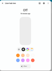 La iluminació ambiental es simple, he comprat bombetes ZigBee Wifi i les tinc donades d’alta a HA. Permet simular dies més calids o tarde/nit configurant color i brillantor