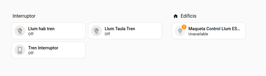 La il·luminació juga un paper important en l’aparença de la maqueta. Controlar mitjançant Arduino i relés és possible, però un cop vols configurar colors i brillantor la complexitat puja. Home Assitant (HA) ja té suport de molts dispositius i permet gestionar escenes: Bombetes WiFi/ZigBee, Interruptors i ESPHome. El resultat final és que des d’un mòbil o web es pot gestionar interruptors, llums, sons, etc